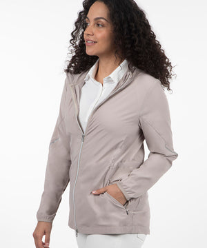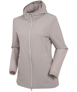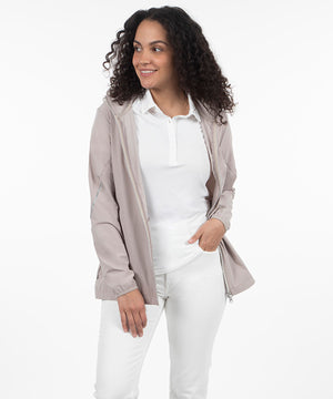 An easy choice for your active life, our Amelia jacket is ideal for combatting wind and water. The lightweight, zip-front design is constructed of ripstop poly and has a WxTech™ coating that provides wind-resistance and water-resistant benefits, keeping you dry and comfortable whether you're on the golf course or out for a run. It's hooded with a roll and snap-down feature to keep it tidy when not in use. The stretch side and back panels are highly flexible for extra mobility, with zippered hand pockets and a back waist adjustment.