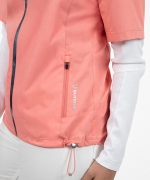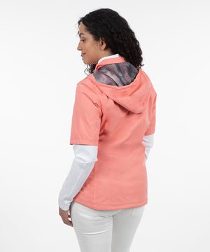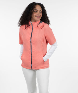 I love this jacket because it is flattering. I am pear shaped and am not petite….I bought XL. Although I love the jacket, I wished it was just a little roomier (like their long sleeved rain jackets) through the hips and/or had a zipper that I can open up the bottom or the top…. This is why I only gave it a 4 star review. Otherwise….great jacket