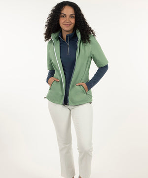 I love this jacket because it is flattering. I am pear shaped and am not petite….I bought XL. Although I love the jacket, I wished it was just a little roomier (like their long sleeved rain jackets) through the hips and/or had a zipper that I can open up the bottom or the top…. This is why I only gave it a 4 star review. Otherwise….great jacket