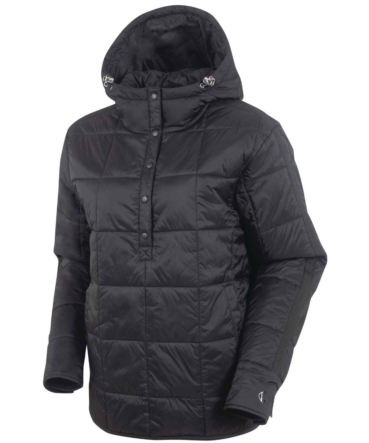 Modern Pullover Design — Quilted silhouette with long snap-front placket, decorative tape detailing, and an oversized adjustable hood.